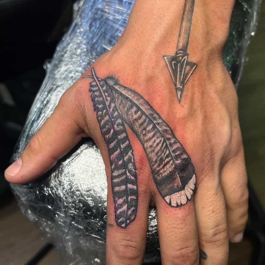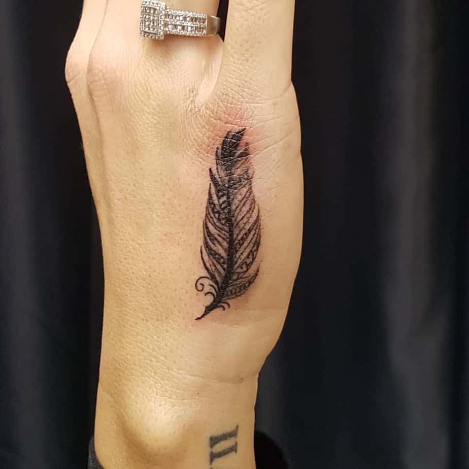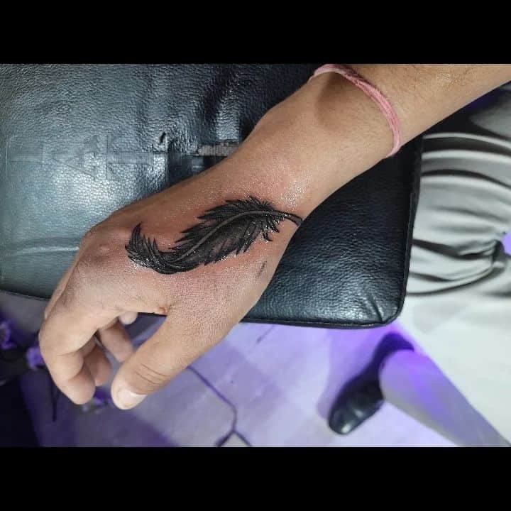 Hands don’t have tons of real estate, so fine-line tattoos actually shine there. This style reads elegant and light, like the feather is barely touching your skin. If you want subtlety and grace, fine lines are your friend.
