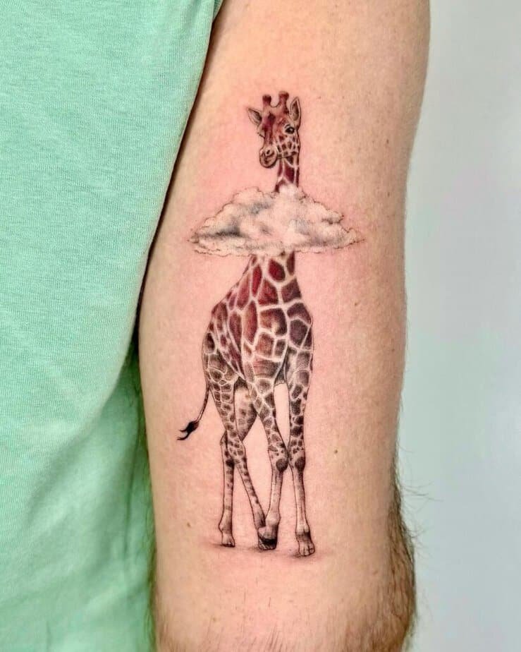 This cartoon-style giraffe inflating a red balloon is pure friendliness. It captures that surprising tenderness giraffes have: big animals but soft-hearted. It’s the kind of tattoo that makes you smile whenever you notice it.