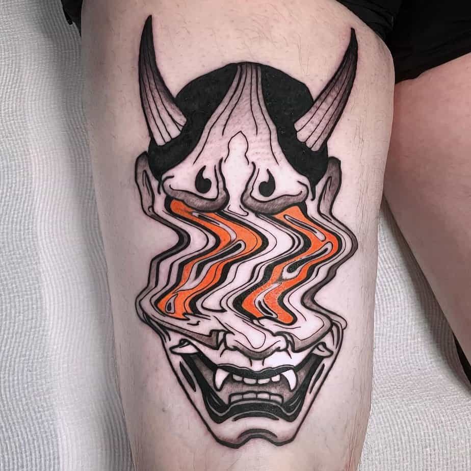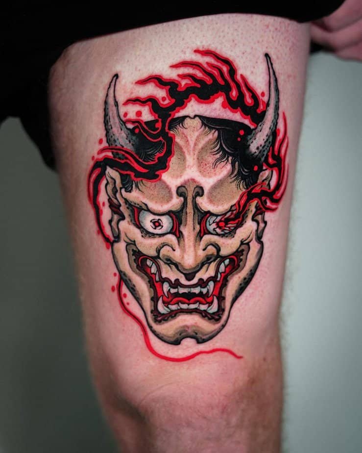 Bright red flames and crazed eyes: this thigh piece is pure heat. If you want your ink to feel combustible, this one definitely delivers.