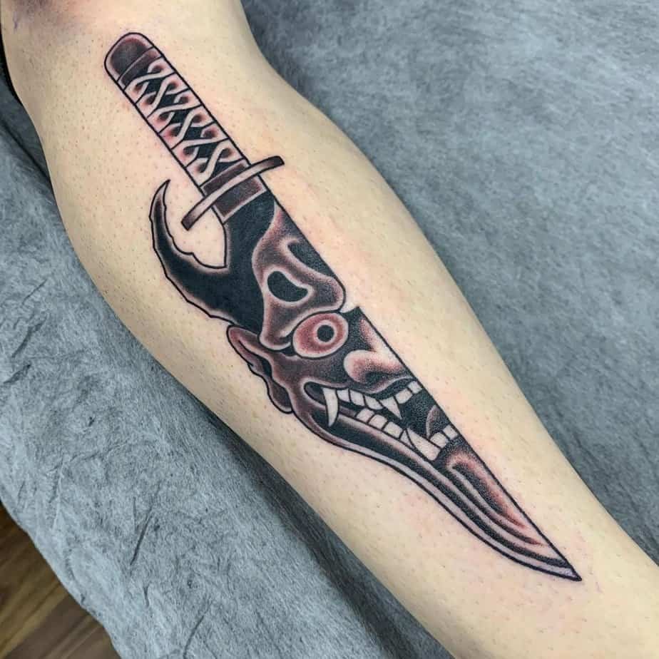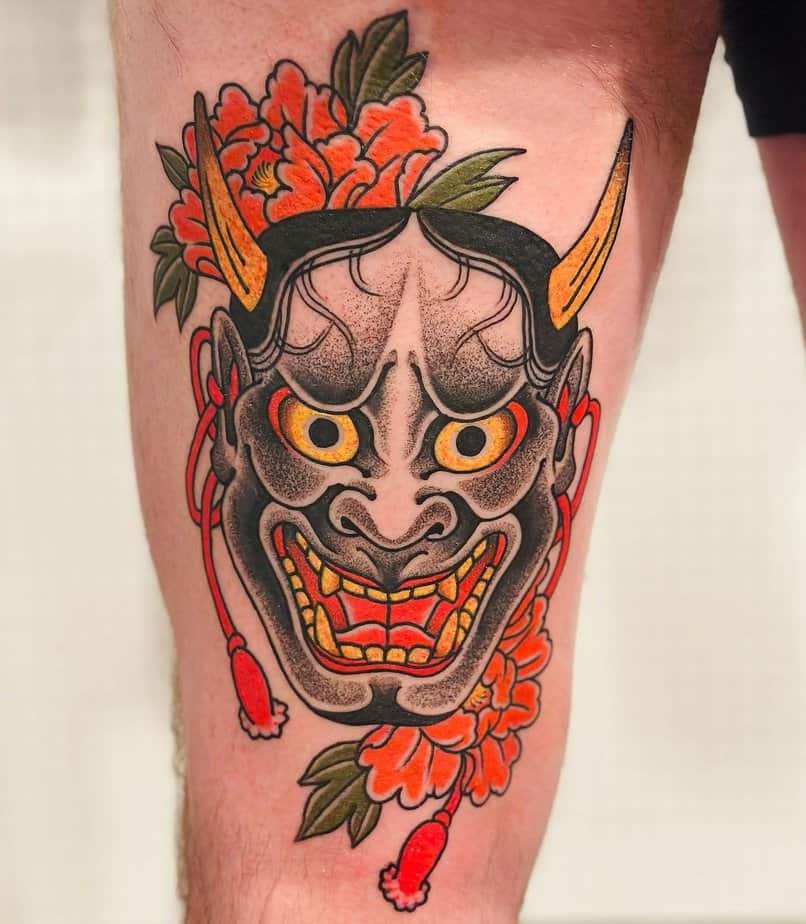 Surrounded by orange flames, the Hannya here looks like it’s about to leap off the skin. It’s vivid, loud, and perfect for anyone who treats their body as a bold statement.