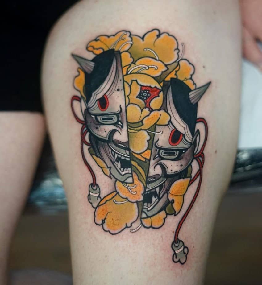 This one mixes abstract splashes of color with classic Hannya lines—rebellious and modern. It’s for people who love traditional symbolism but want to break the rules a little.