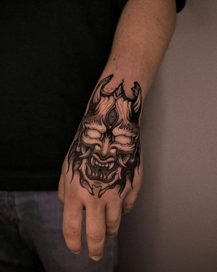 Putting a Hannya on your hand is bold as hell—every handshake becomes a little unsettling. It’s intimate, attention-grabbing, and kind of theatrical in the best possible way.