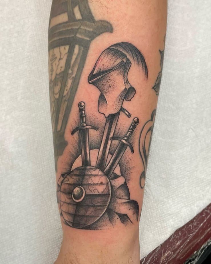 Sometimes you don’t need the whole figure. A helmet tattoo says, "These values protect me," — impervious to arrows, a quiet emblem of resilience and the ideals that outlast the body.