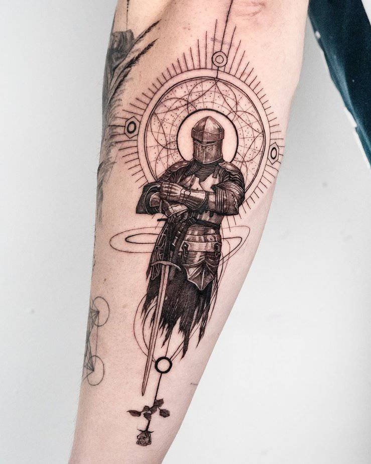 If you want your knight to read a little mysterious, go abstract. Geometric shapes add visual intrigue and modern edge, and the small rose tucked beneath the knight brings a sweet counterpoint—nobility mixed with softness.