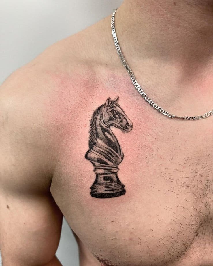 Swap a human knight for a chess piece and you get symbolism with a cerebral twist. Placed over the chest, it sits near the heart and reads as strength, cunning, and purpose.