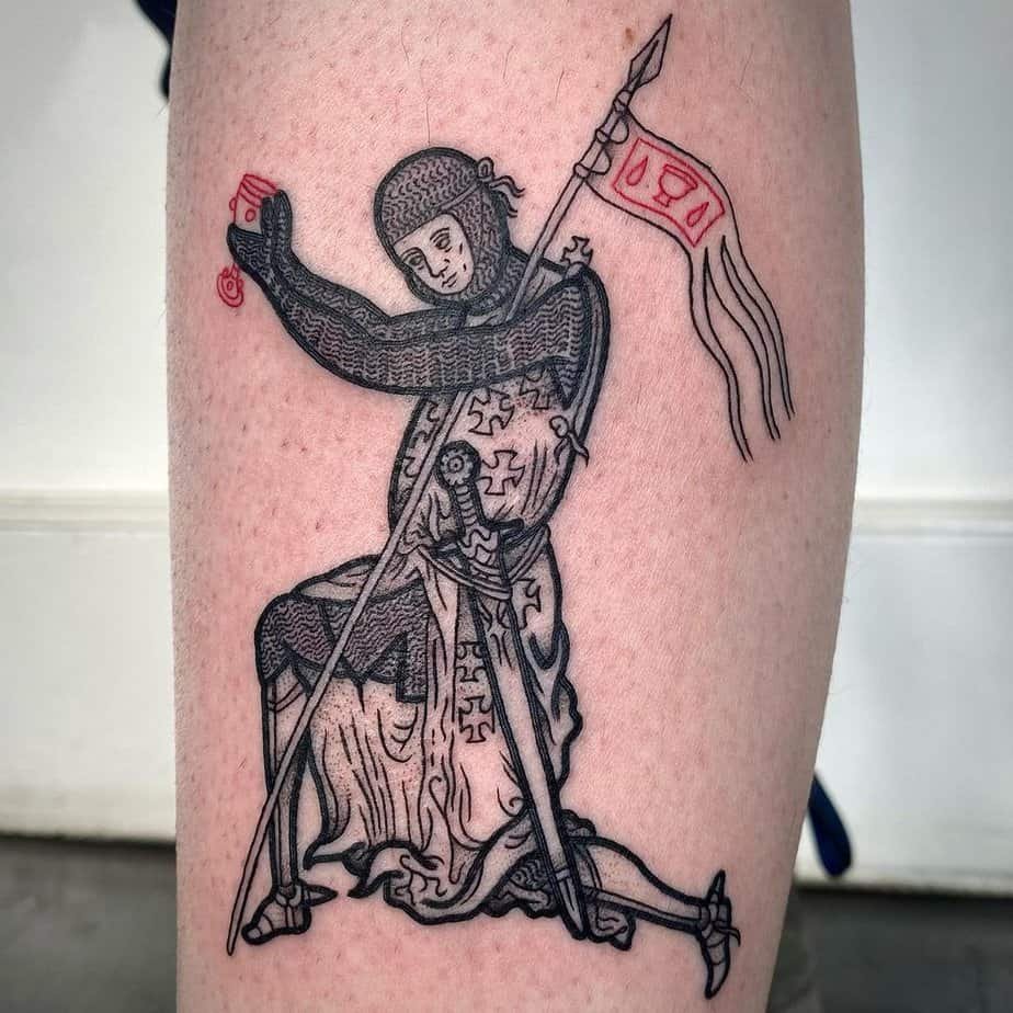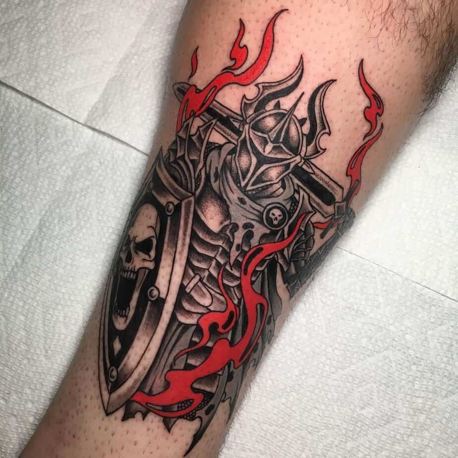 Here’s a sweet idea for pairs: matching shin tattoos with a Mister and Lady knight. The male shown as a skeleton is a lovely, dark nod to mortality—reminding us that everyone’s temporary, but love and commitment can be fierce. Knights live with the awareness of death, and that urgency often makes loyalty and courage feel more meaningful.