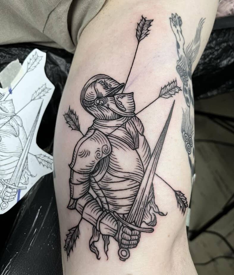 A knight riddled with arrows but still clutching his sword — that image is everything. It’s about loyalty to the end, the kind of strength that’s stubborn and heartbreaking at once. Perfect for anyone who wants a tattoo that speaks to unbreakable resolve.