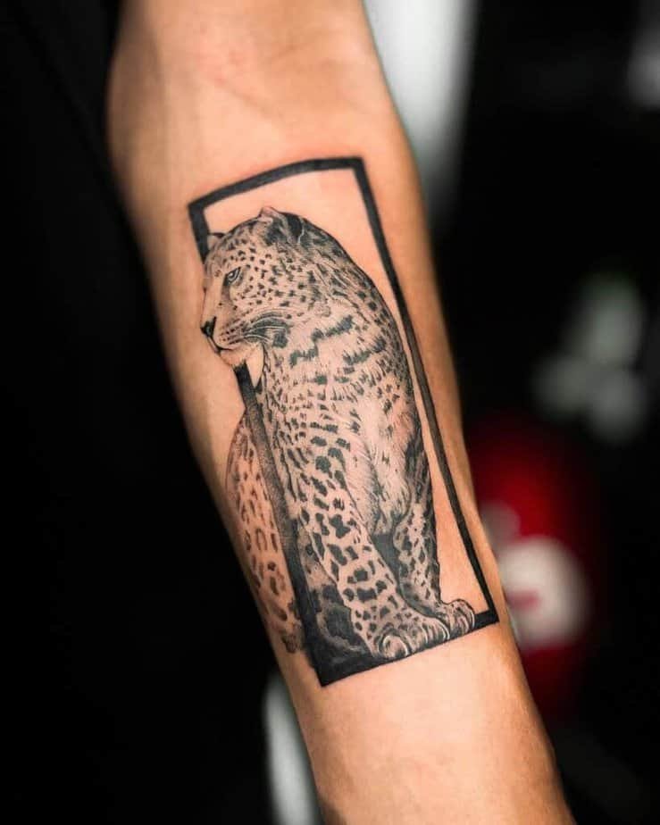 A regal leopard inside a clean geometric frame on the forearm — the lines make the expression look contemplative, like the animal is in deep thought. It’s refined and a little regal, great for someone who wants dignity and calm power in one image.