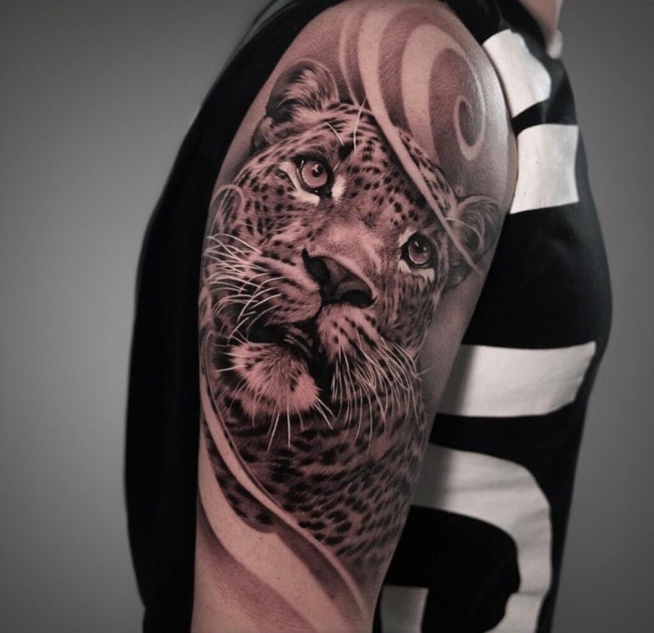 Okay, so picture this on the upper arm: an intense, hyper-detailed leopard face where every whisker and fur line is crisp. It’s the kind of tattoo that reads as strength and fearlessness at first glance, but up close it’s pure artistry. Perfect if you want something that looks powerful and personal.