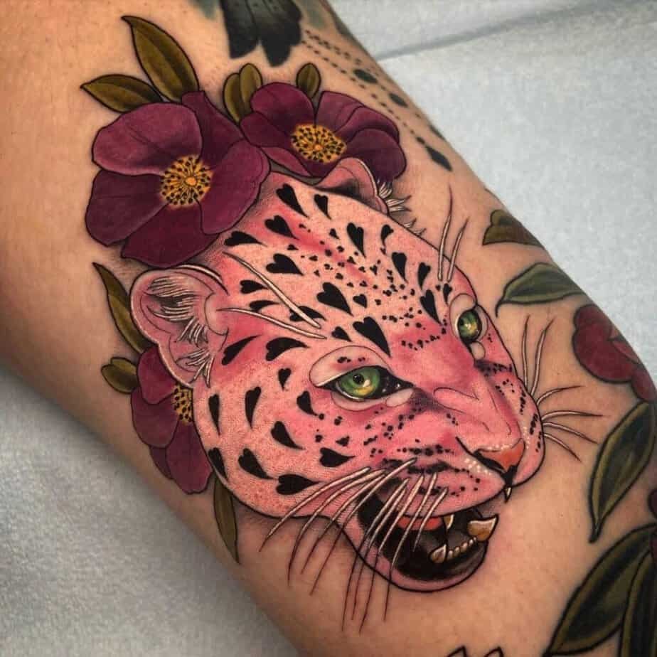 A leopard woven with vivid red leaves — it’s fierce and delicate at once. On the forearm it reads like a small story about balance: strength wrapped in gentle foliage. If you like the idea of nature elements softening a powerful creature, this one feels like a hug and a roar at the same time.