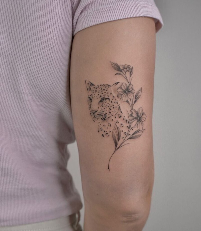 This one feels like a secret garden moment — a leopard peeking through fine botanical details on the upper arm. It’s minimalist in energy but full of presence, perfect for folks who want something understated yet undeniably captivating.