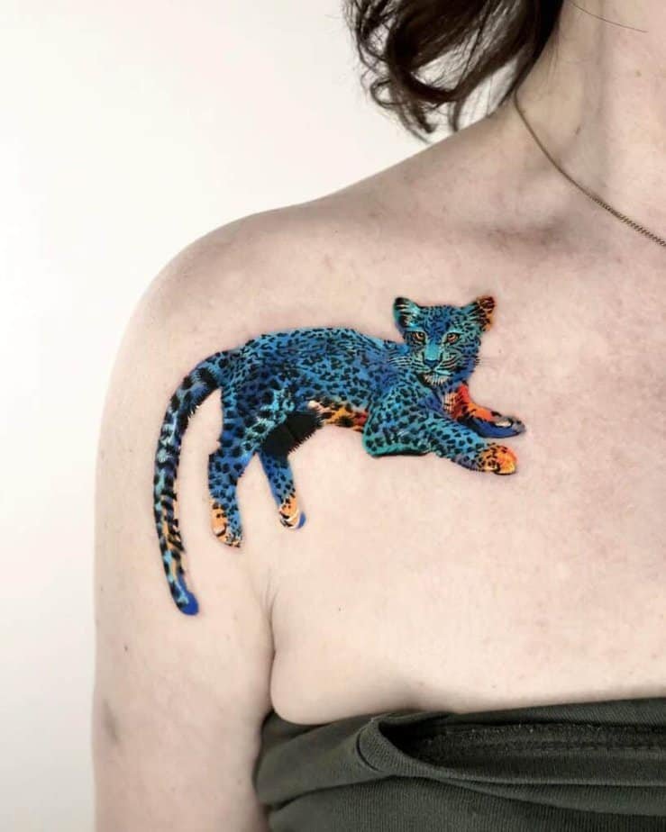 Vibrant blues and oranges give this shoulder piece a fantastical vibe. Colors change the whole energy — suddenly it’s less a portrait of nature and more a piece of personal mythology. If you love color and want to stand out, this is a joyful option.