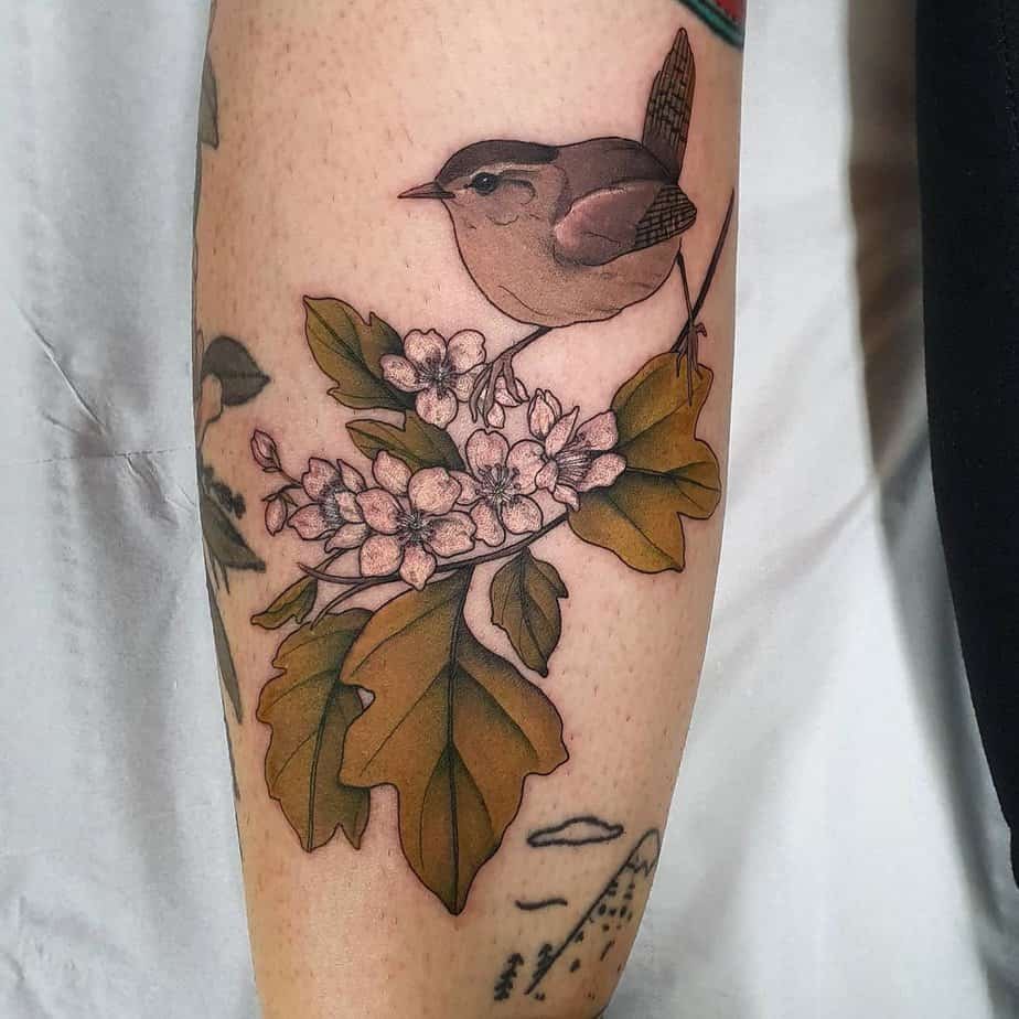 A swallow carrying hawthorn across its wings? Too cute. The color and dotwork give it warmth, and symbolically it’s about true love and loyalty — the kind that can really change the trajectory of your life. If someone in your life makes you feel that deep, tell them; tattoos like this celebrate that feeling.