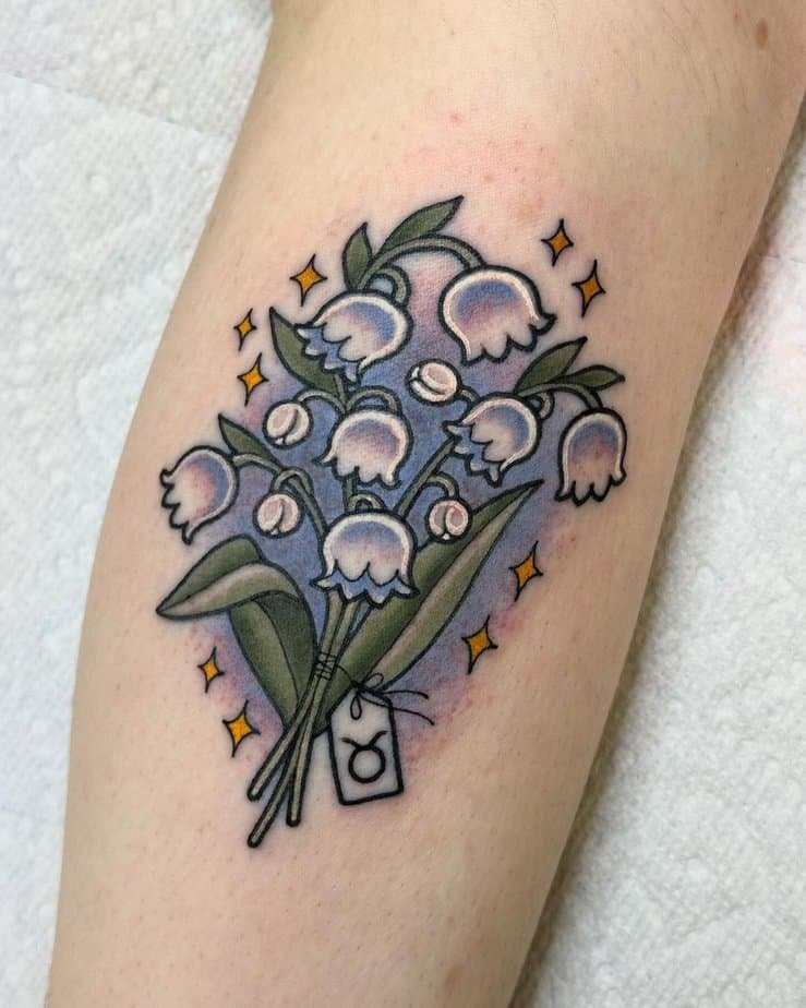 If you’re a Taurus who wants your birth month front and center, this design blends your sign into lilies of the valley with dreamy stars and hues. It feels like a tiny charm that honors the month and the story you’re living.