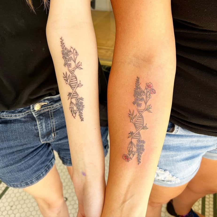 If you want to nod to the literal connection between you, DNA strand tattoos are clever and meaningful. Add flowers or little symbols to soften the science and make it beautiful.