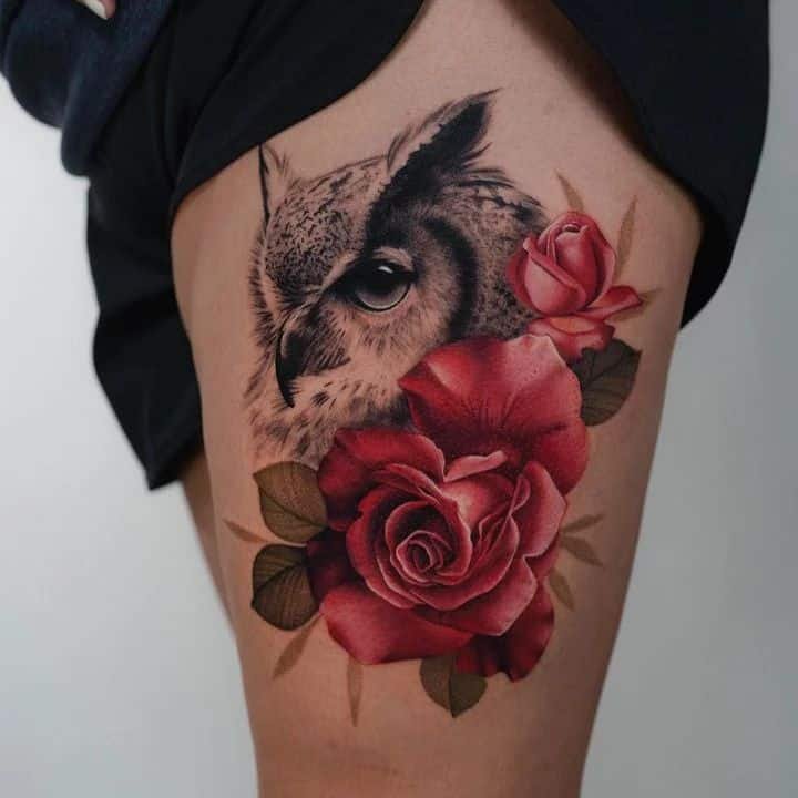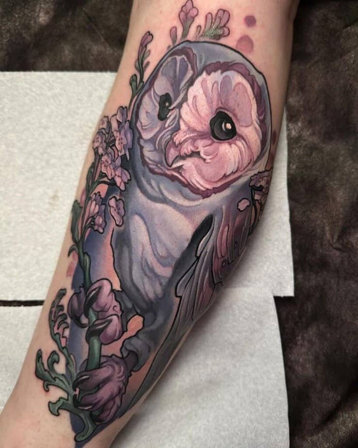 If you want your owl to feel softer without losing its strength, throw flowers into the mix. The owl stays the focal point, but blooms above and below give the design warmth and balance. You can pair a realistic black-and-gray owl with painterly, outline-free flowers in color, or keep everything muted and let texture do the work. Wildflowers are a lovely option if you want something less traditional, and tiny owls with minimal outlines can still pack a soulful gaze that feels like it’s looking right into your chest.
