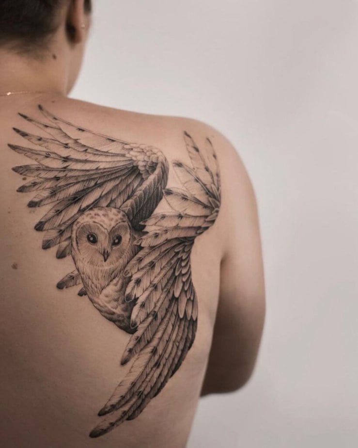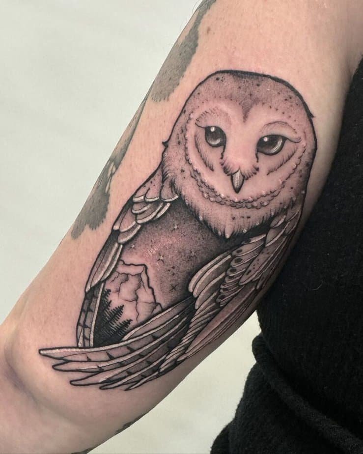 Okay, black and gray is classic for a reason — it’s moody, timeless, and honestly kind of cinematic. Some of these are minimal and exist mostly to guide, not to flex; others pack mountains and trees into the body of the bird so it feels like a whole landscape living on your skin. Watch for eyes — a tiny pop of color in the gaze can make the piece feel eerie in the best way. You’ll also see how an owl in motion feels fairytale-ready when wings are detailed and the composition follows the curve of your body. If you like texture, this style nails it through shadowing and negative space — feathers that look soft and a wing that feels protective like it’s sheltering a tiny forest.