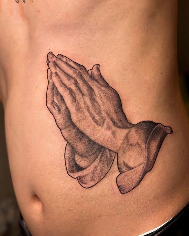 Rib tattoos always feel personal because they’re close to the body and a little hidden. Praying hands here read like a private pledge or a quiet source of strength—something you carry over your heart and feel with each breath.