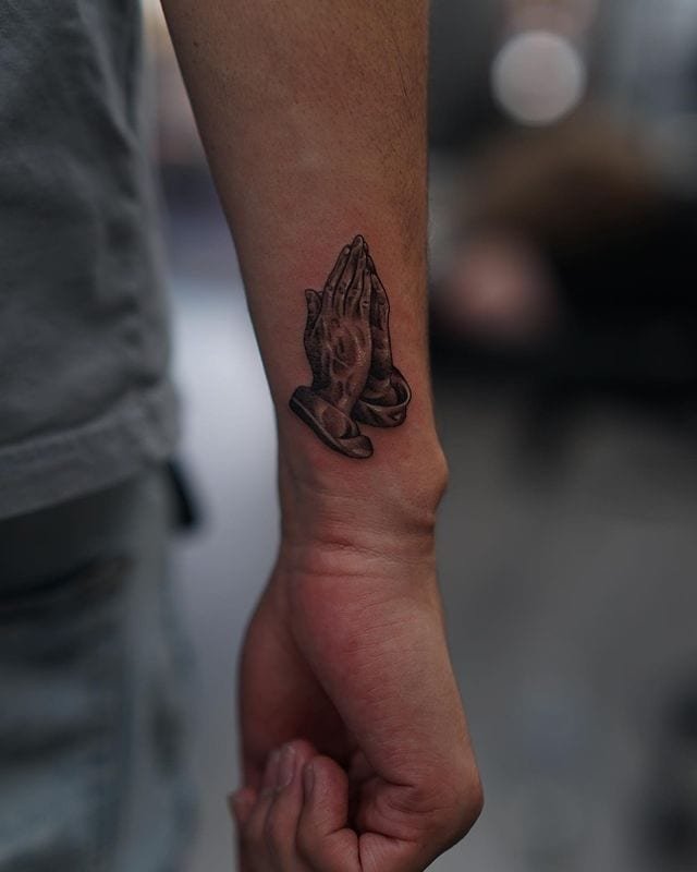 Small tattoos can be the most intimate. This miniature praying hands design carries weight far beyond its size—perfect if you want something subtle that still holds real meaning.