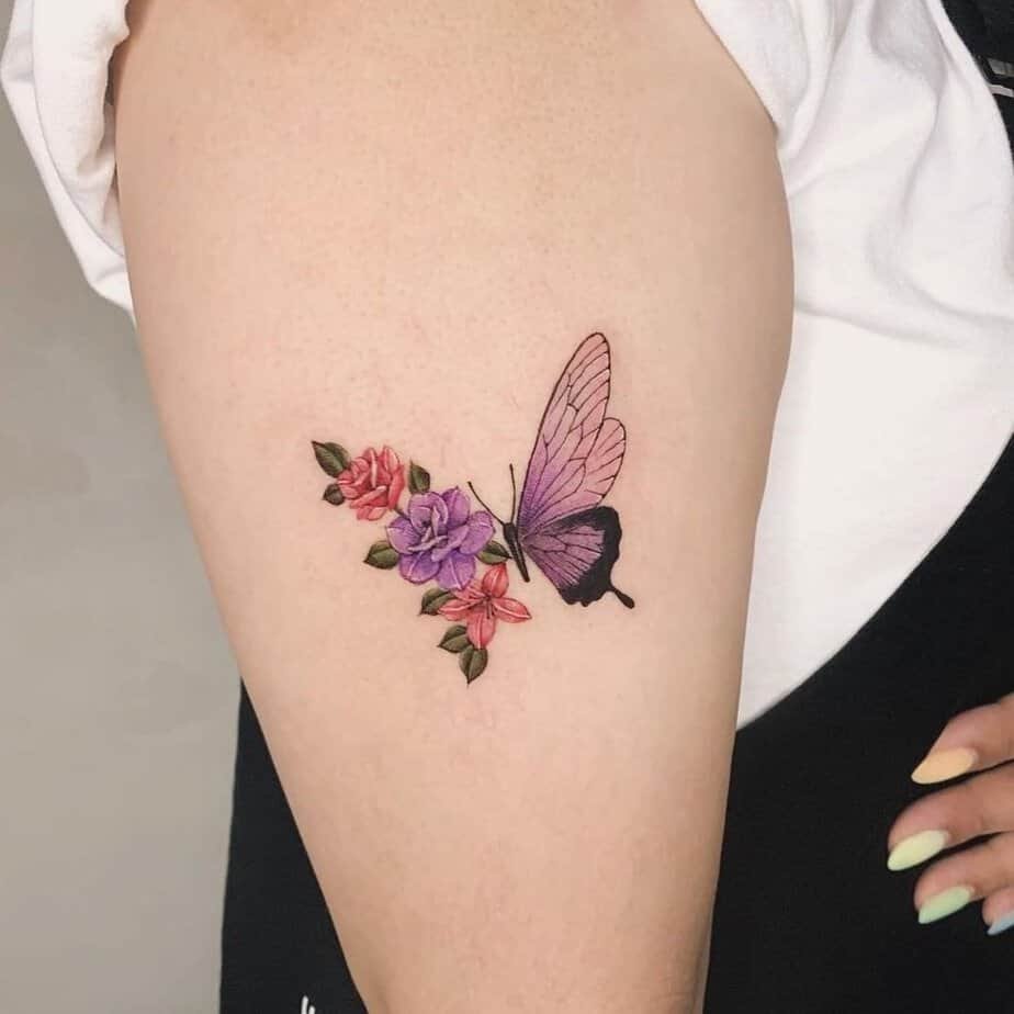 This upper-arm piece is basically a little surprise: a purple butterfly whose wing blooms into three different flowers, each with its own color and personality. Purple butterflies already shout transformation, but pairing one with flowers makes the message sweeter — no matter what you go through, you’ll keep blooming.