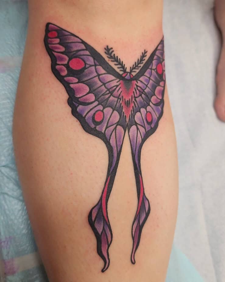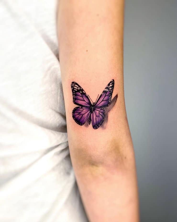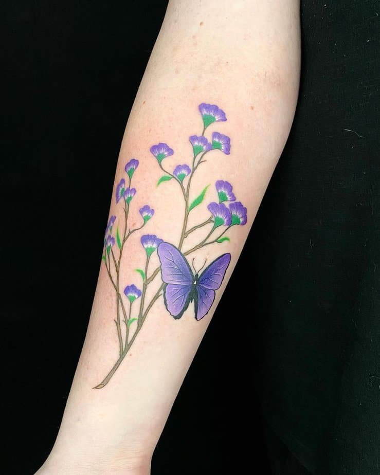This forearm tattoo leans into the mysterious side of purple — deeper tones that feel a little ethereal. It’s the kind of piece that makes you want to whisper about it; purple butterflies can symbolize wonder and the unknown, so if you want ink that feels like moonlight and secrets, this gives off that vibe.