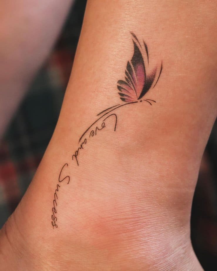 This sweet ankle tattoo pairs a small purple butterfly with the words “love” and “success,” placed as if they’re carried on the butterfly’s wake. It’s not shouting for attention, but it quietly nudges you toward hope and healing — perfect if you want something subtle with a little pep talk built in.