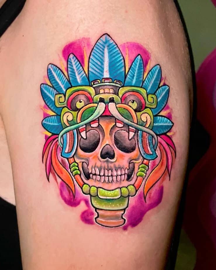 Bold? Yes. Stunning? Also yes. These chest pieces use natural, vibrant hues to highlight Quetzalcoatl’s link to the elements. It’s for folks who want to make a statement and stay connected to the beauty of the natural world whenever they glance down.