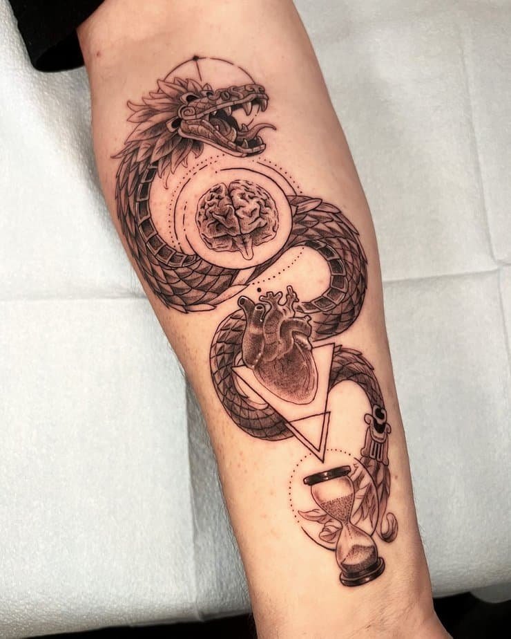 Here’s a design that’s thoughtful as heck: Quetzalcoatl woven together with motifs of the heart, brain, and time. The serpent stands for compassion and intellect, and the time element is a gentle nudge that our hours are limited — so try to live in a way that honors both your heart and your head. It’s a meaningful mashup if you want your tattoo to speak to balance and purpose.