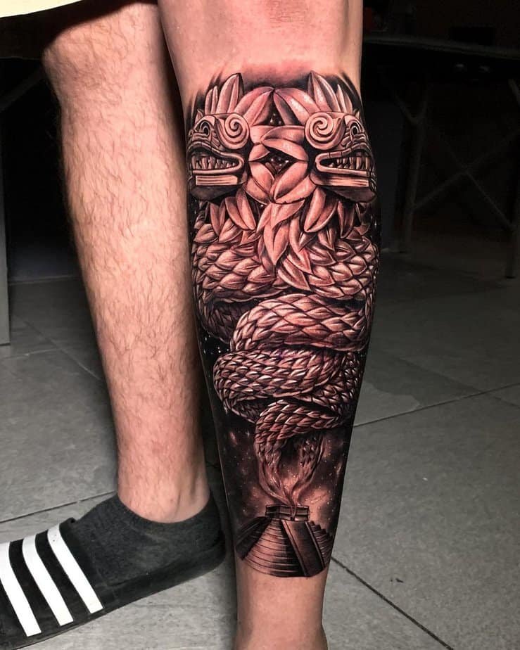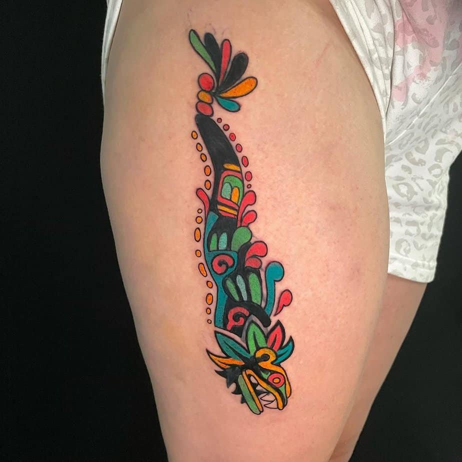 Want something quieter but meaningful? A traditional Quetzalcoatl on the thigh is perfect — easy to hide when you need to, and powerful in symbolism. It highlights duality: the bird side for spirit, the serpent for earth. Together they’re a reminder of the deep ties between both realms.