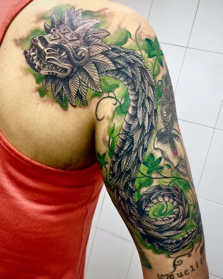 Quetzalcoatl surrounded by nature (shoulder to upper arm)