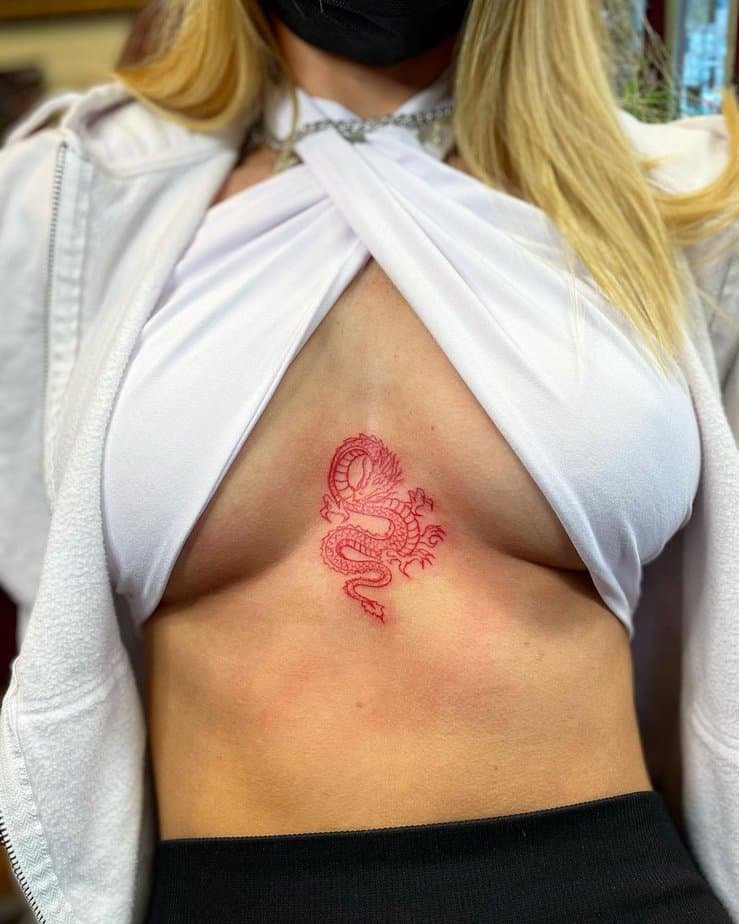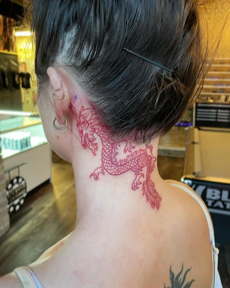 Practical and flirty: hair down hides it, hair up shows it off. If you want something versatile and a little cheeky, the back of the neck is a perfect spot for a red dragon.
