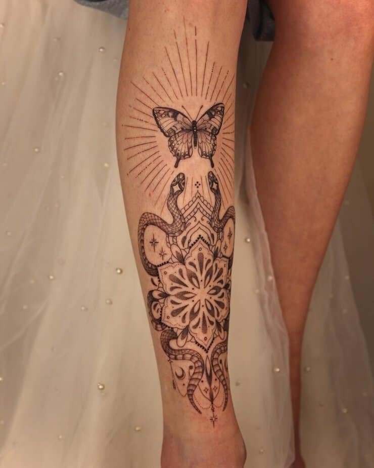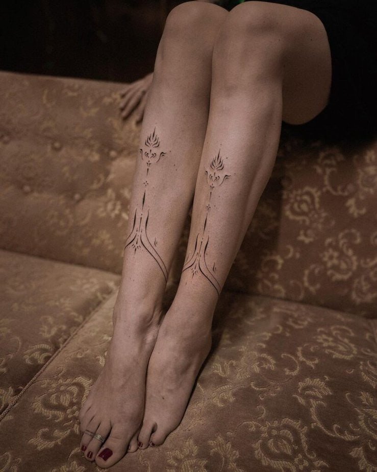 Ornamental tattoos are super flexible — you can embellish them with everything from snakes to butterflies to create something unique. It’s like curating a tiny personal museum on your leg.