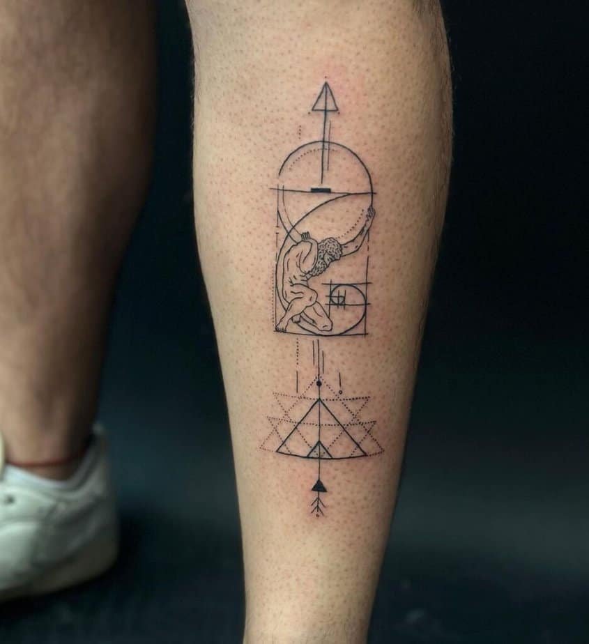 Geometric tattoos appeal if you like order and symmetry. Lines, circles, and triangles come together to make something oddly calming and satisfyingly precise. On the shin they can look architectural and clean.