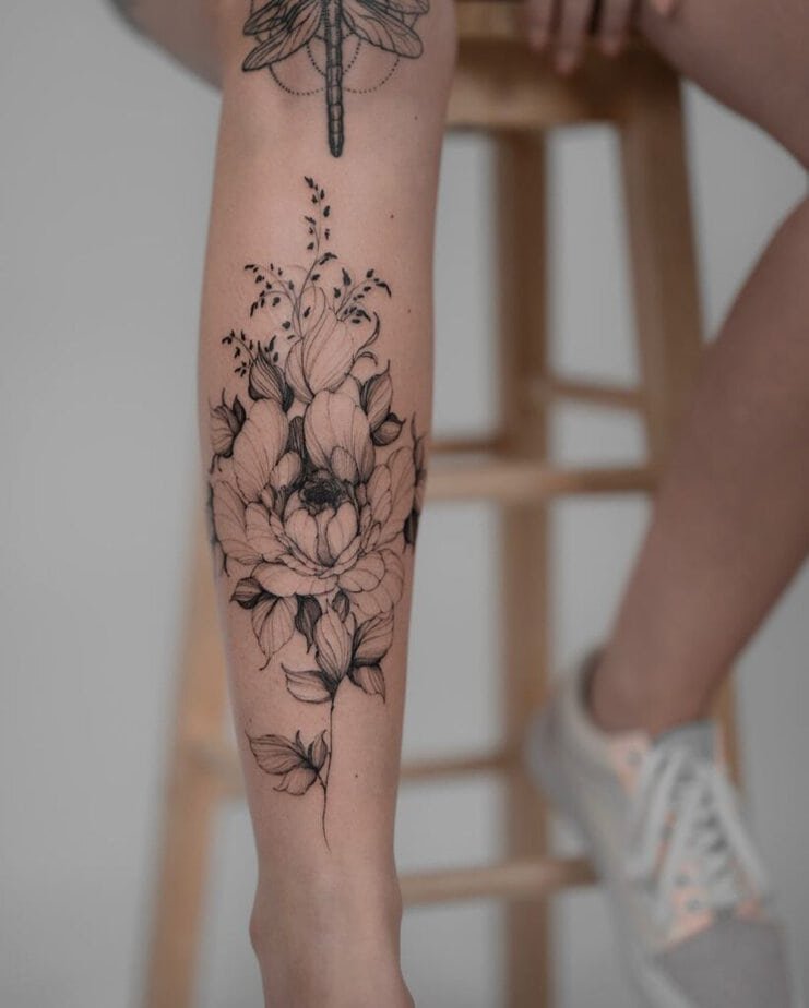 Peonies are a perfect note to end on: big, beautiful, and romantic. Whether you choose peonies, roses, or wildflowers, a floral shin piece can leave you feeling fancy and confident.