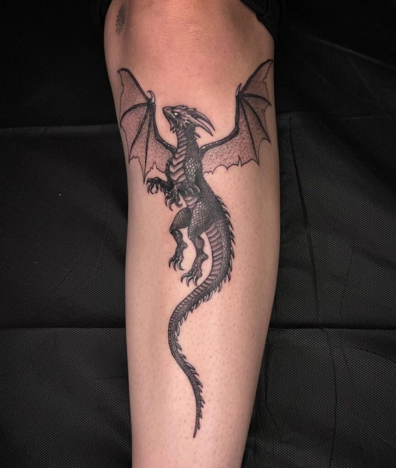 Dragon tattoos are dramatic and gorgeous, especially when done with detailed blackwork. They read as powerful and fantastical, and on a long canvas like the shin, they can really stretch and flow.