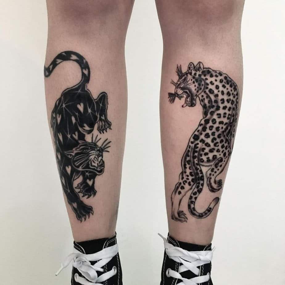 Panthers and leopards across both shins — duet energy