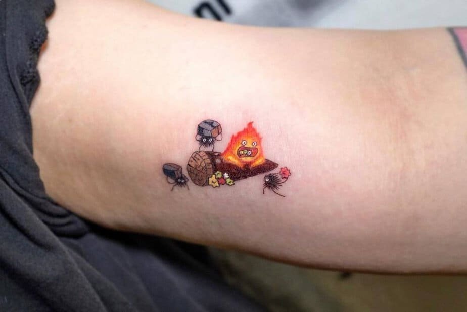 Okay, picture this: mischievous soot sprites hanging around Calcifer’s warm, cranky little flame. The soot sprites bring that playful energy while Calcifer brings the sass and glow. It’s colorful, a touch chaotic, and basically a tiny portal to Howl’s Moving Castle every time you glance at your skin.