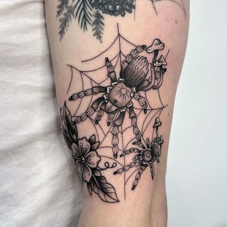 Some folks collect spider imagery like others collect flowers or birds. If you love tarantulas, pairing them with a fine-line web in black and gray creates this dramatic, slightly gothic look that’s actually stunning.