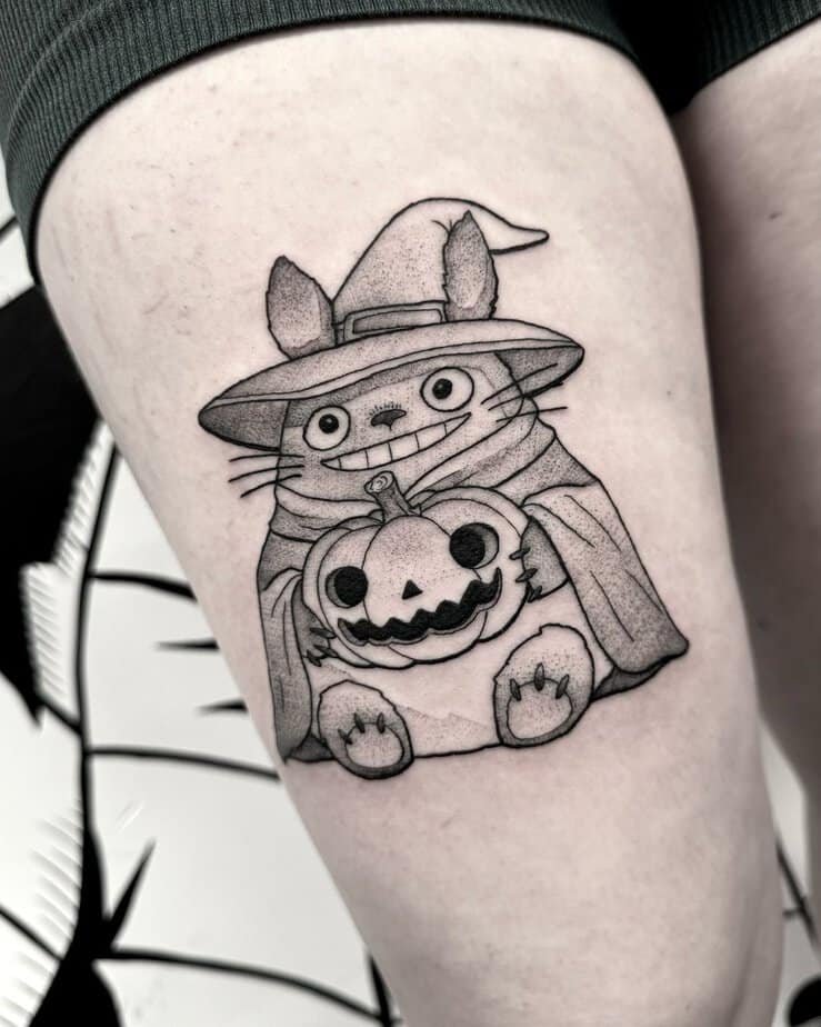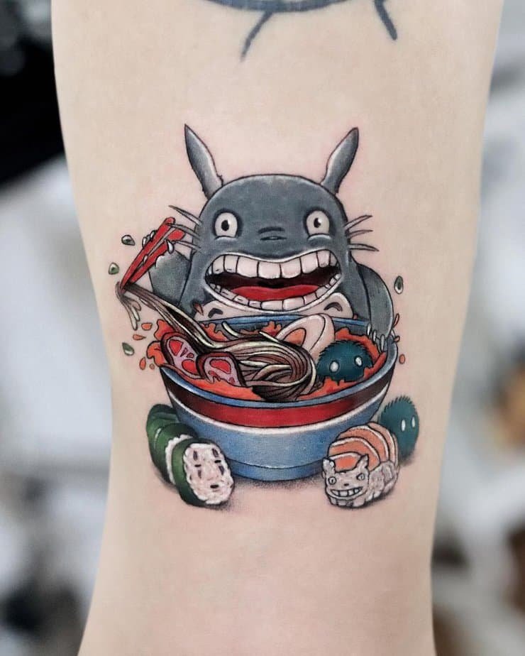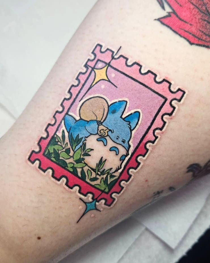 Totoro snuggled in clouds, surrounded by stars—this tattoo is basically a lullaby in ink form. It’s peaceful and sleepy in the best way, a perfect pick for daydreamers or anyone who loves the idea of drifting off under a starlit sky.