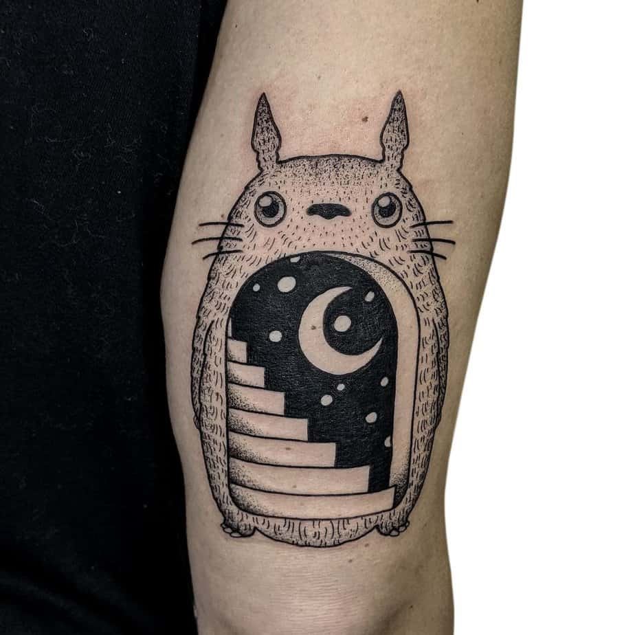 Black-and-white, with a staircase leading into a starry sky hidden within Totoro’s belly—this one feels like a little secret you carry with you. It’s surreal, a touch introspective, and perfect if you like your ink to have hidden depth.