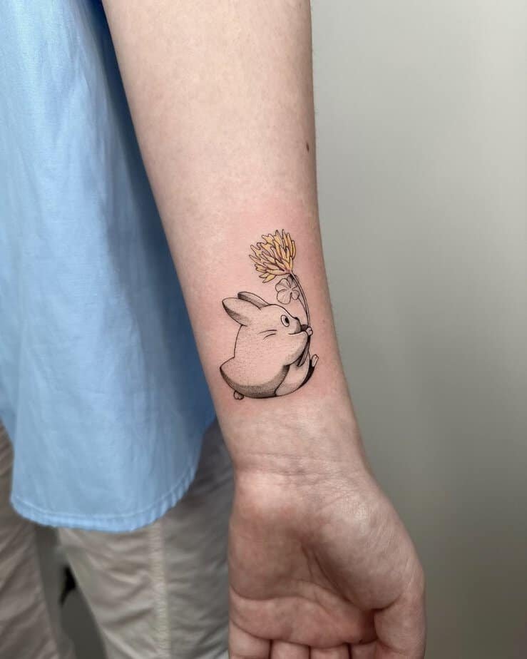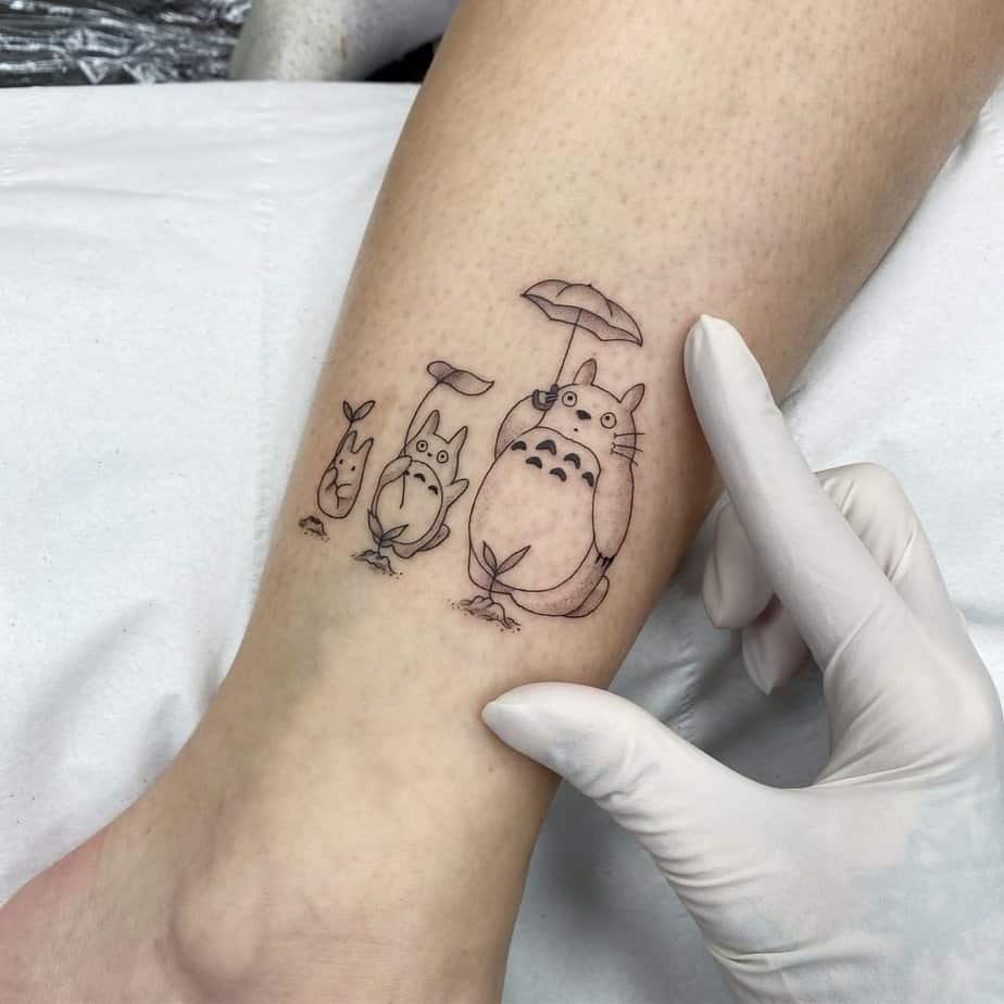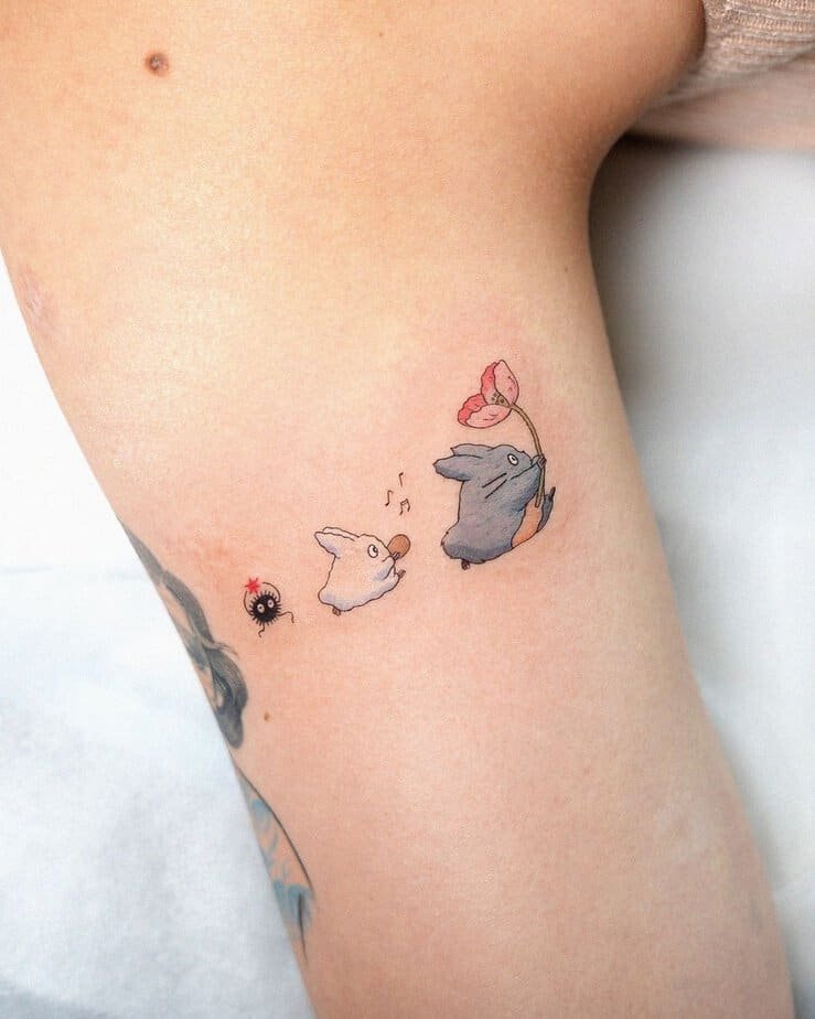 A little parade of tiny Totoros with a soot sprite and a floral friend—this design proves small tattoos can be endlessly charming. It’s the kind of detail that makes people smile when they notice it, and it carries a lot of heart in a tiny space.