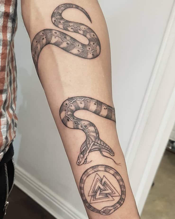 Putting serpents around or through the Valknut introduces purposeful tension. One snake wrapped around, another devouring — the balance between order and chaos becomes part of the story. It’s dark, thoughtful, and a bit wild.
