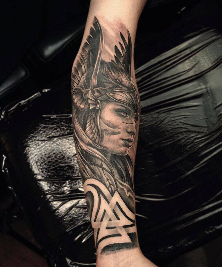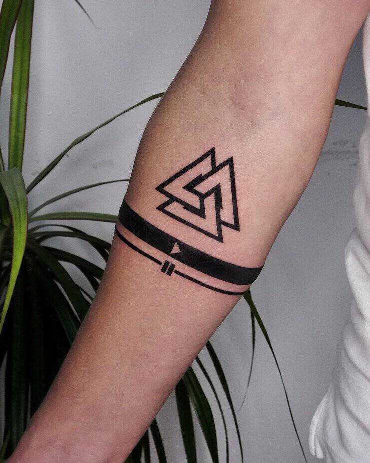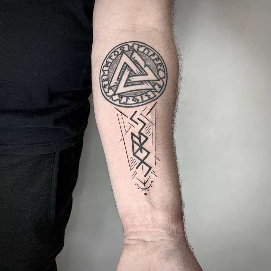 There’s something so clean about a small, bold blackwork Valknut on the forearm. It reads strong without being loud. And if the idea of Odin’s knot — the three triangles that hint at the Allfather’s power over fate — speaks to you, this placement is a steady little reminder that destiny isn’t totally fixed. It feels freeing, honestly.