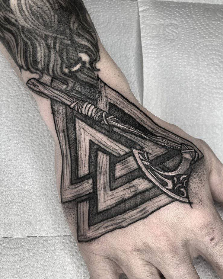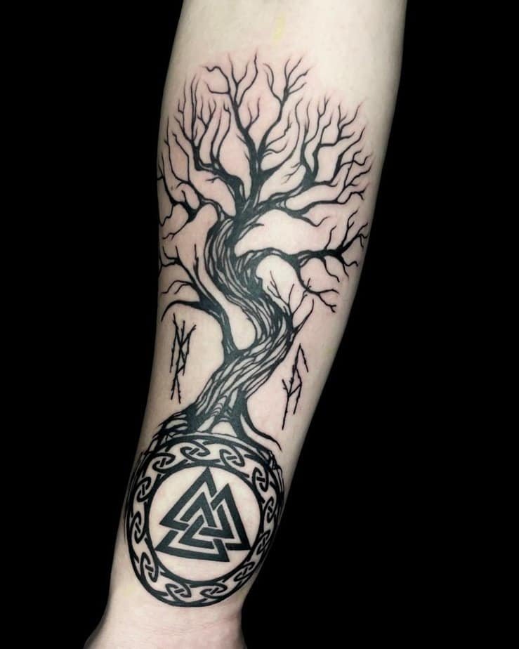 If you want your tattoo to feel like an heirloom, go intricate. This style folds the Tree of Life symbolism into the Valknut and makes the whole thing feel like a map of personal growth — fall, rise, repeat. It’s the kind of piece that reads differently every time you look at it.