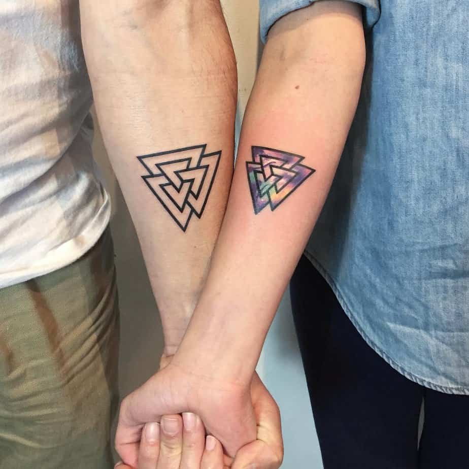 Thinking of matching ink? You can go classic black for one person and a dreamy galaxy of blues and purples for the other — or both pick color if you’re feeling bold. One simple Valknut, one vibrant version: both say the same thing about connection and shared meaning, but in different voices. Do what feels like you two.