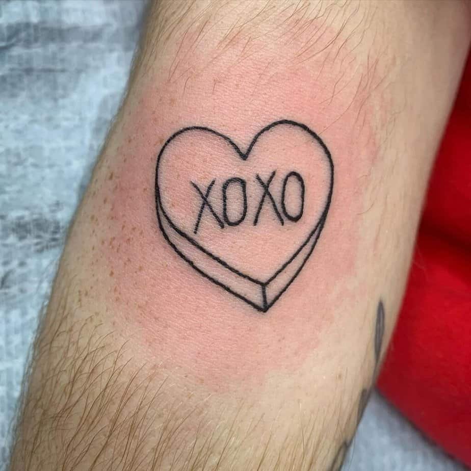 This is where XOXO gets playful. Treat it like the end of a handwritten note and put it somewhere unexpected — it can read like a secret message only visible at certain angles. Some people love the raw, freehand look, like it was written straight onto the skin with no stencil, which gives it a unique energy. If you’re feeling bold, inside-the-lip tattoos are delightfully private (and surprising). Or change the O’s into hearts, lean into a trash-polka vibe for dramatic contrast, or tuck the letters into a candy-heart shape for something nostalgic and cute. You can also mix masculine and feminine elements — sharp X’s with soft heart O’s — or add kissing lips to play up the meaning. There are realistic smooch designs that look like a lipstick mark plus hand-drawn letters, and it’s oddly romantic and joyful at the same time.
