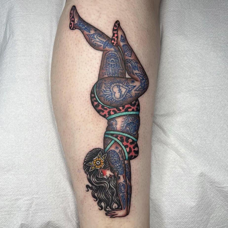 Inversions always feel like a little rebellion — seeing the world from another angle. This tattoo adds floral and geometric patterns to that upside-down stance, turning strength and balance into something quite beautiful.