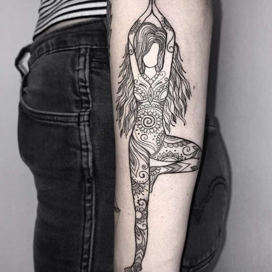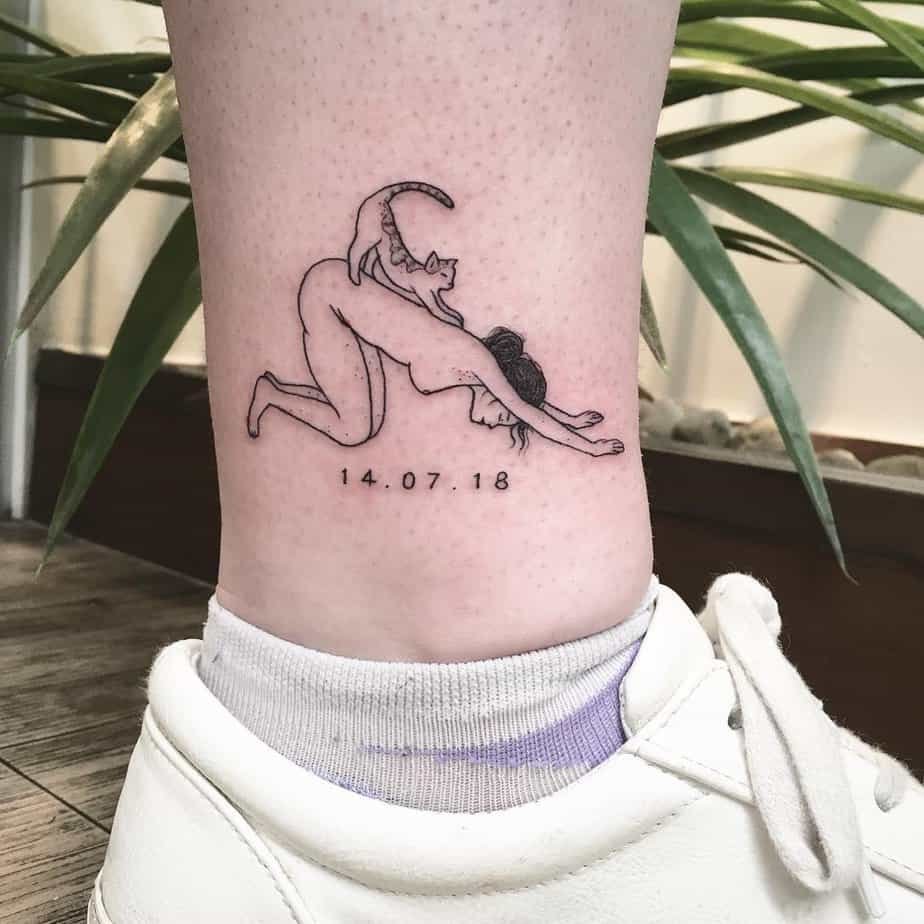 Okay, this one makes me grin. Imagine a woman in downward dog and a curious cat photobombing the whole calm vibe. It’s simple, playful, and personal — especially with a date tucked underneath to mark a memory. It’s the kind of tattoo that says yoga doesn’t have to be serious all the time; sometimes it’s just love and laughter on a mat.